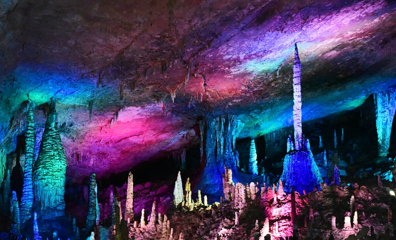 張家界武陵源的黃龍洞,號(hào)稱世界溶洞奇觀,今年九月份,我懷著探秘的心境前來欣賞。洞內(nèi),頭一段路較為平坦,約百米,漸漸踏上了石階,燈光灰暗,眼前的一切都顯得模糊,導(dǎo)游小邱說洞中有幾層,展現(xiàn)在眼前的是一個(gè)豪華的“歌舞廳”,我想那龍王和他的子孫們?cè)谥匾墓?jié)日定然在這舞廳展示風(fēng)采吧!殿堂里燈光不停的閃爍,色彩斑闌,隱隱約約看見它的小女兒正在與情人約會(huì),手牽手低低切切,情意綿綿……這個(gè)大廳名曰:“龍舞廳”,之外,還有天堂宮、天仙宮、后宮、龍宮……